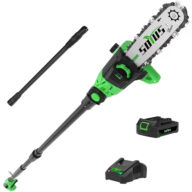 SOYUS Pole Saw 8-Inch Cordless, 15-Foot Max Reach Electric Pole Saw for Tree Trimming, 16ft/s Speed, Auto Oiling, Multi-Angle Pole Chainsaw with 2.0Ah Battery & Charger